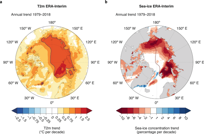 Évolution de la température et de la concentration en glace par décade en Arctique - via Nature