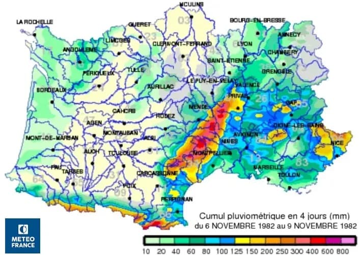 Cumuls de précipitations relevés en France entre le 6 et le 9 novembre 1982 – Météo-France