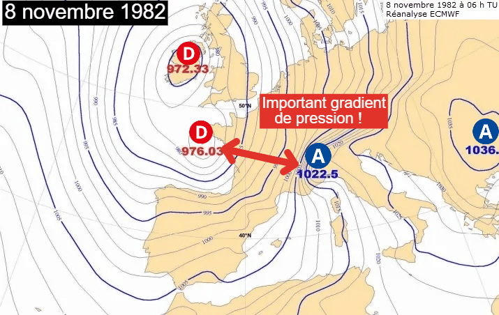 Entre le 6 et le 8 novembre 1982, une dépression très creuse s'avance de l'Atlantique vers le nord-ouest de la France alors qu'une dorsale anticyclonique est présente sur l'Europe centrale, s'étendant jusqu'au nord de l'Italie.