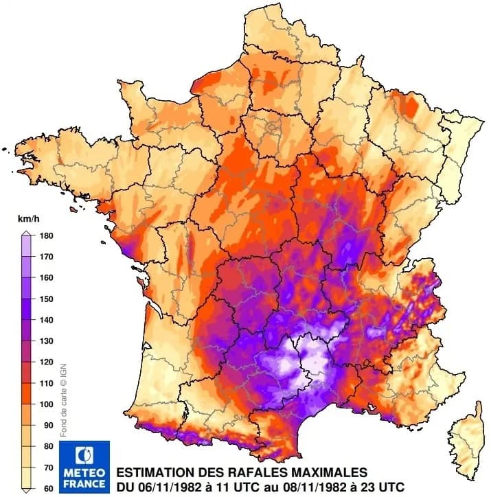Rafales de vent maximales relevées sur la France entre le 7 et le 8 novembre 1982 – Météo-France