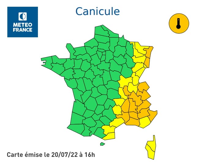 En conséquence, Météo France a maintenu une vigilance orange à la canicule sur 14 départements. Parmi eux, 12 départements du quart sud-est de la France allant du Languedoc aux départements alpins. Par ailleurs, les deux départements alsaciens restent également en vigilance orange pour la nuit du mercredi 20 au jeudi 21 juillet 2022 uniquement. Ils quitteront la vigilance dès jeudi matin.