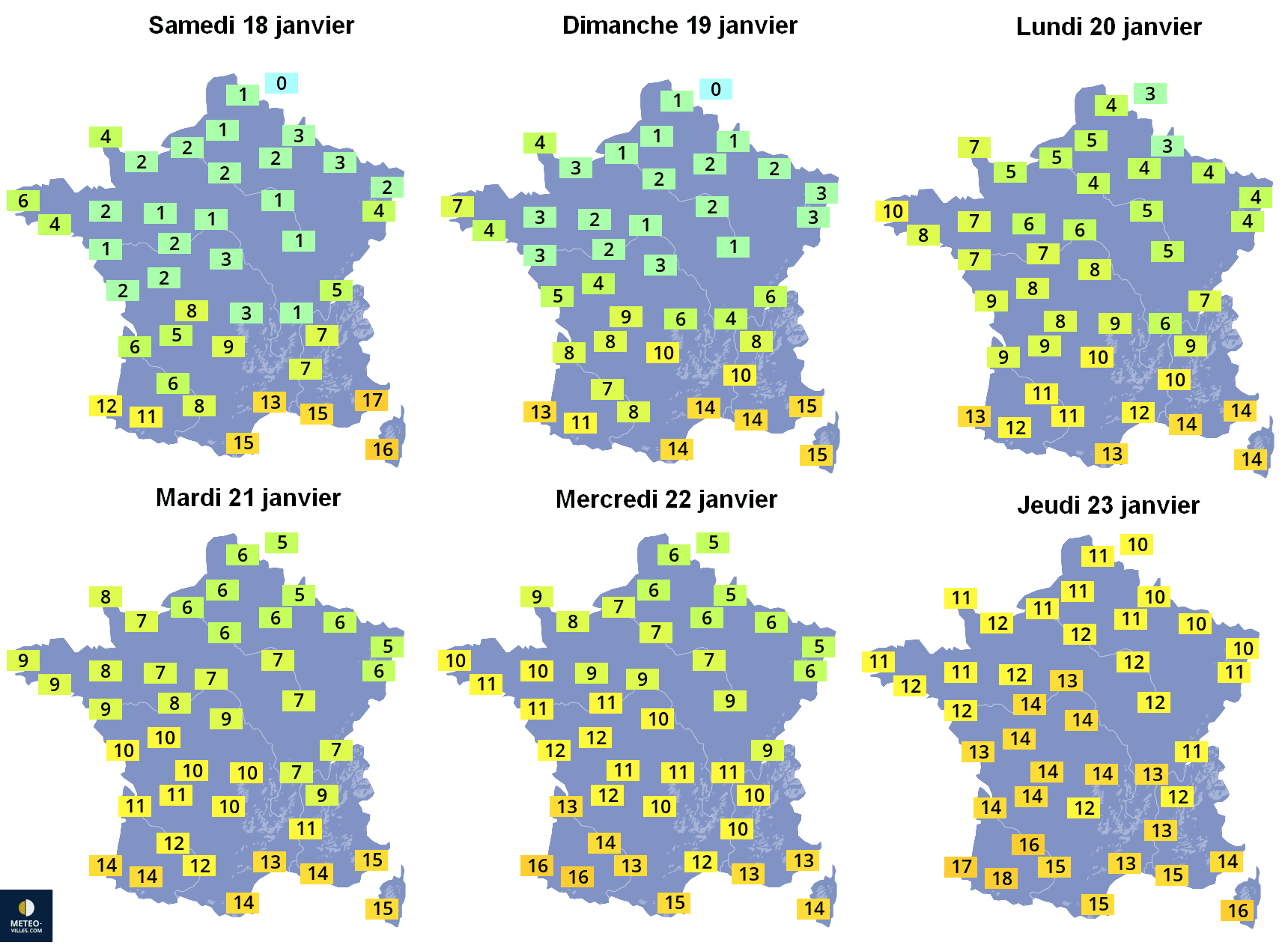 Évolution des températures maximales en France entre le 18 et le 23 janvier 2025 – Météo-Villes