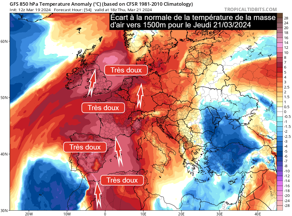 Écart à la normale de la température de la masse d'air vers 1500m le jeudi 21 mars 2024 - via tropicaltidbits.com