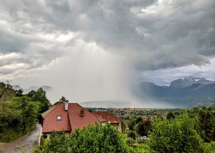 Les régions alpines ont également assisté à une convection assez marquée ce dimanche 15 mai 2022. Les cellules orageuses sont multipliées sur les sommets en débordant parfois sur les plaines environnantes. Présentant un caractère stationnaire, ces orages ont produit des pluies diluviennes parfois accompagnées de grêle, comme l'illustre la photo ci-dessous prise en direction du lac d'Annecy.