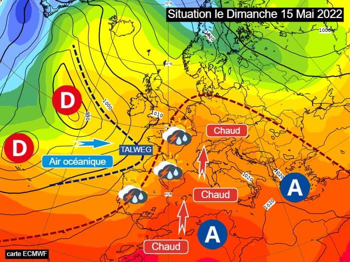 C'est une situation orageuse classique qui s'est mise en place ce dimanche 15 mai 2022. L'anticyclone s'érigeait du bassin méditerranéen à l'Europe Centrale en faisant remonter de l'air chaud sur la France tandis que les dépressions étaient actives sur l'Atlantique. Un talweg associé à ces dernières est venu longer nos côtes atlantiques, favorisant le déclenchement des orages de l'Aquitaine vers l'Île-de-France et la Normandie.