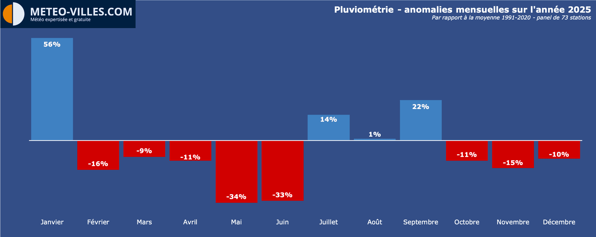 Pourtant, cette année 2025 avait débuté comme s'était terminé 2024, sous des pluies abondantes et des inondations parfois remarquables en janvier (+56%) notamment en Bretagne (avec la succession des dépressions Eowyn, Herminia puis Ivo). Mais cette tendance s'est inversée à partir du mois de février avec des conditions plus sèches.