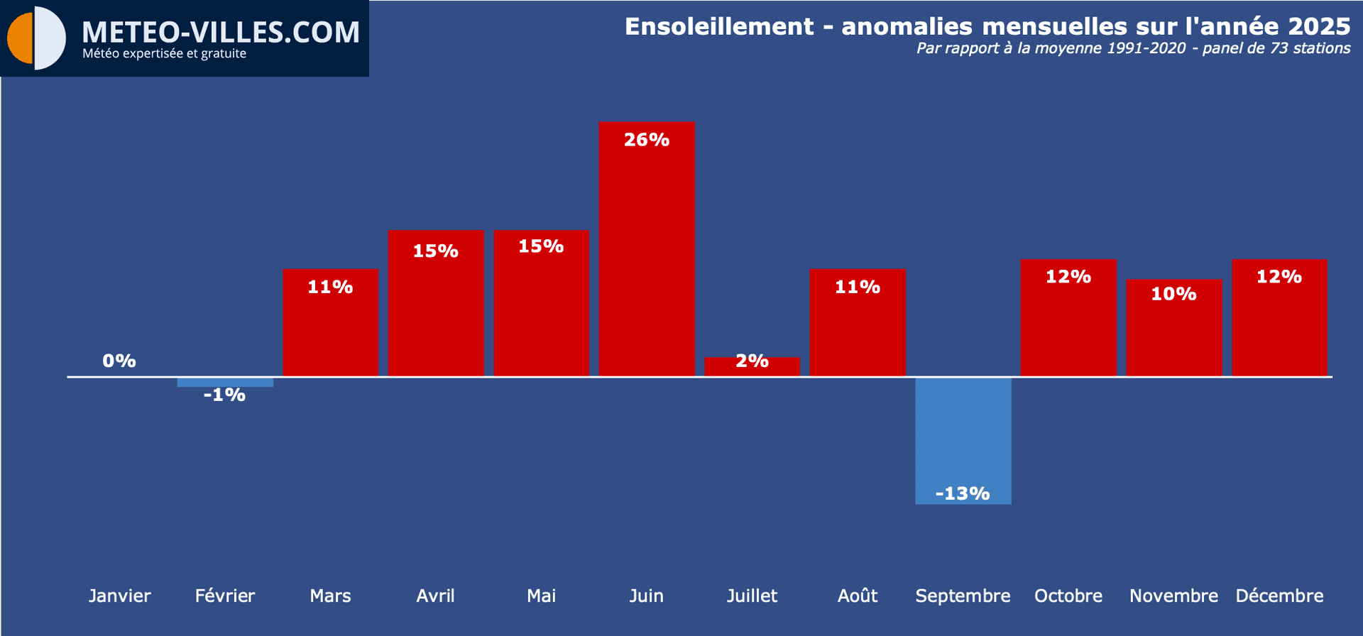Seul le mois de septembre se démarque nettement durant cette année 2025, avec a contrario des conditions bien plus nuageuses (déficit d'ensoleillement de -13%). Janvier, Février ainsi que juillet ont été dans l'ensemble proche des moyennes (malgré des différences selon les régions).