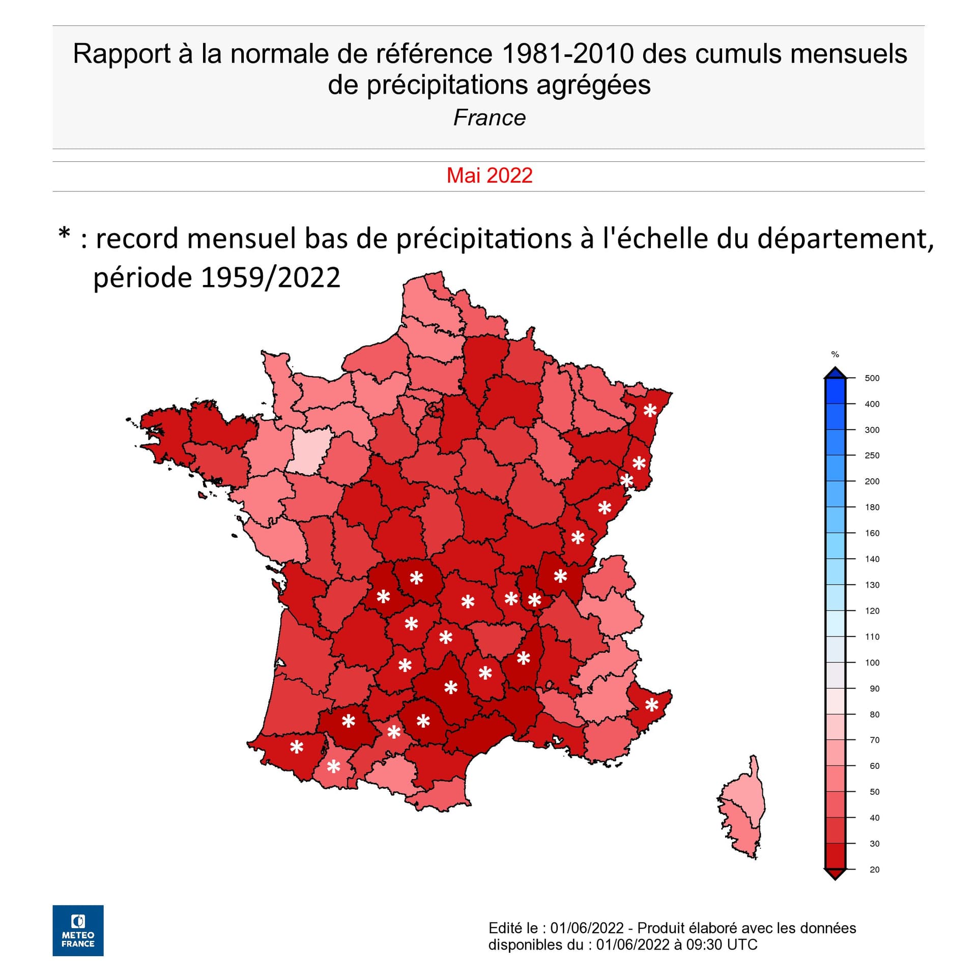 Ce ne sont pas moins de 23 départements qui ont obtenu leur cumul le plus faible pour un mois de mai en plus de 60 années de mesures, depuis les Pyrénées à l'Alsace, en passant par le Massif-Central. Si quelques orages, parfois destructeurs car accompagnés d'immenses grêlons, se sont produits notamment les 15 (>>), 20 (>>) et surtout 22 mai (>>), c'est bien la sécheresse qui s'est dont sensiblement aggravée (>>).