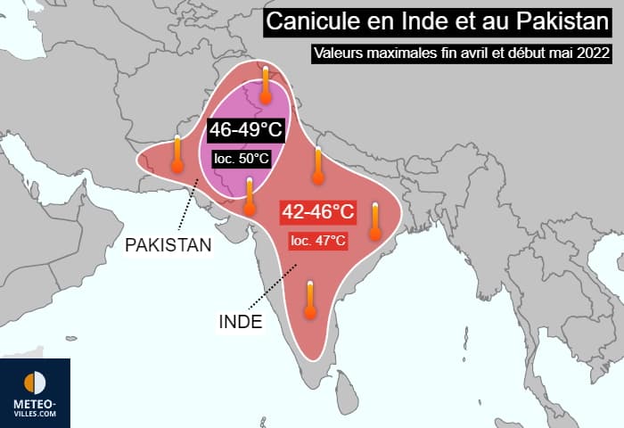 La carte ci-dessous résume les températures les plus hautes attendues en Inde et au Pakistan d'ici le dimanche 1er mai 2022. Il fera souvent entre 42 et 46°C sur de vastes régions de ces pays. Comme mentionné plus haut, c'est au nord-ouest de l'Inde et dans l'est du Pakistan que sont attendues les valeurs les plus élevées avec des valeurs de l'ordre de 46 à 49°C en général, pouvant atteindre localement les 50°C ! Précisons que les records du mois d'avril sont de 48,3°C en Inde (en 1958) et de 50,2°C au Pakistan (en 2018). Ils sont donc menacés.