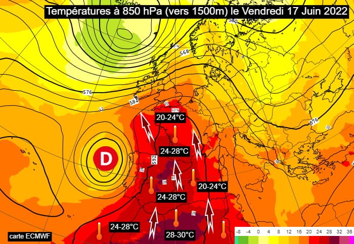 La journée du vendredi 17 juin 2022 marquera un nouveau réchauffement de la masse d'air, atteignant les 20°C à 1500m d'altitude jusque dans le nord du pays et dépassant les 25°C sur tout le tiers sud ! Les fortes chaleurs vont donc se généraliser avec 30 à 35°C en général dans le nord et l'est mais souvent entre 37 et 40°C de la basse vallée du Rhône au sud-ouest et jusqu'au bassin rennais ! Des valeurs de l'ordre de 40°C sont attendues vers la Garonne entre Toulouse et Bordeaux et ce seuil pourrait localement être atteint dans le sud des Pays de la Loire ! Des pointes de 41°C sont envisagées dans certaines localités du sud-ouest (notamment sur le midi-toulousain et le limousin) !