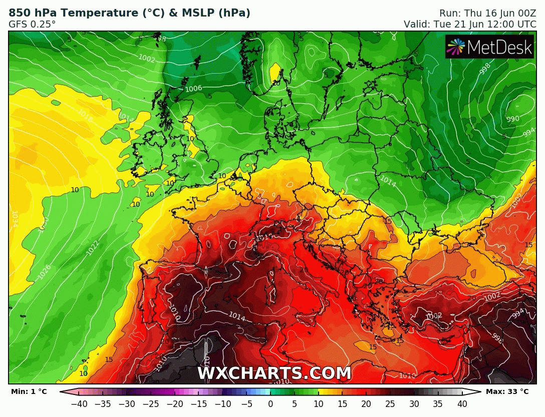 Animation des températures à 850 hPa sur l'Ouest de l'Europe du 22 au 25 juin 2022 - Modèle GFS via WX CHARTS