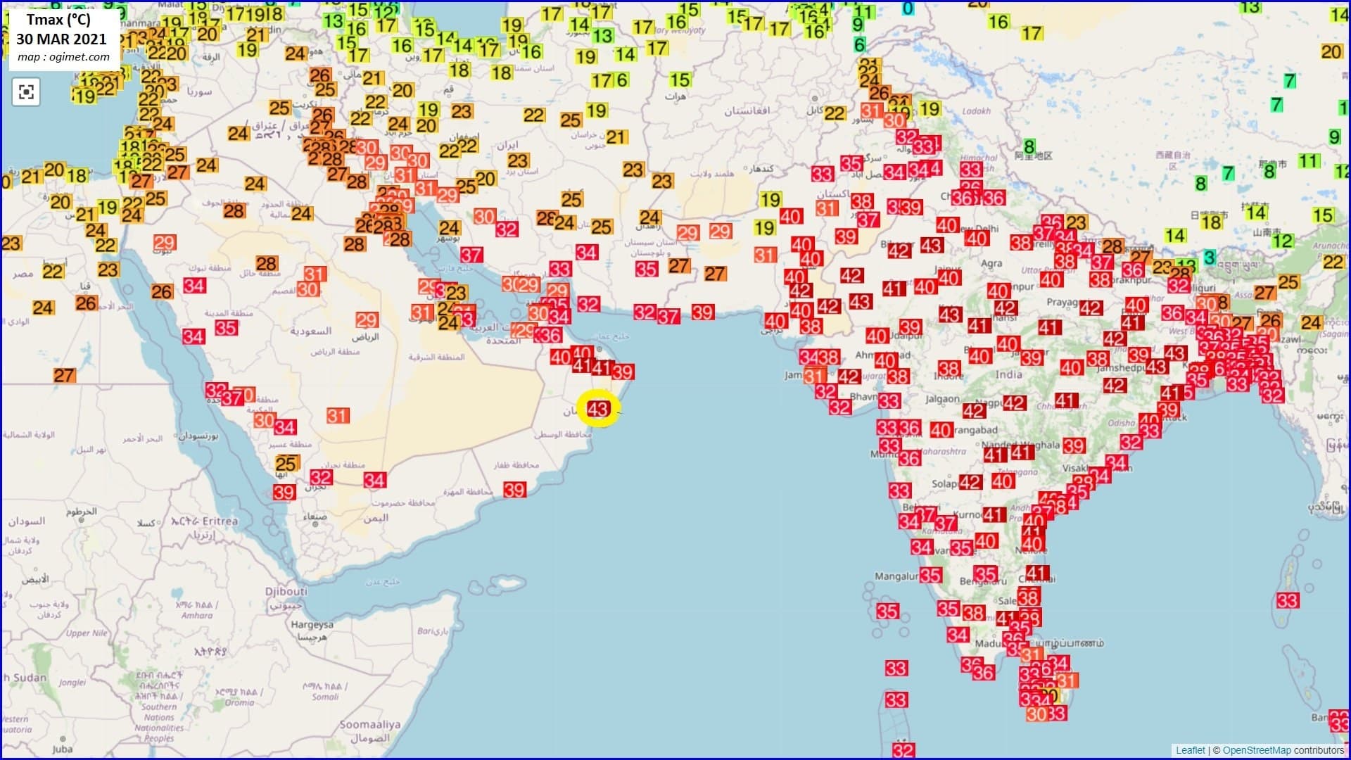 Températures maximales relevées sur le Moyen-Orient et l’Inde ce 30 mars 2021 – Via twitter : @Ekmeteo