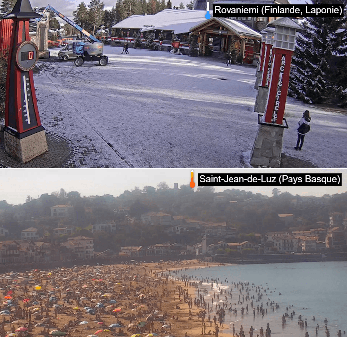 Ainsi, cette première décade du mois d'octobre 2023 offre des contrastes remarquables en Europe. Dans le sud de la France, on atteignait localement les 34°C ces dernières heures et l'Espagne a établi un nouveau record national début octobre avec 38,2°C à Montoro ! À l'inverse, les premières neiges sont observées dans certaines régions scandinaves. C'est notamment le cas en Laponie dans le nord de la Finlande où le village du Père Noël a été blanchi pour la première fois de la saison. Contrairement à la chaleur record de nos régions, ces flocons sont habituels en octobre dans cette région qui se situe au niveau du cercle polaire.