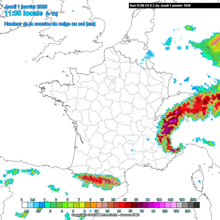 Évolution de la couche de neige prévue vendredi en France - modèle météo ICÔNE - Météociel