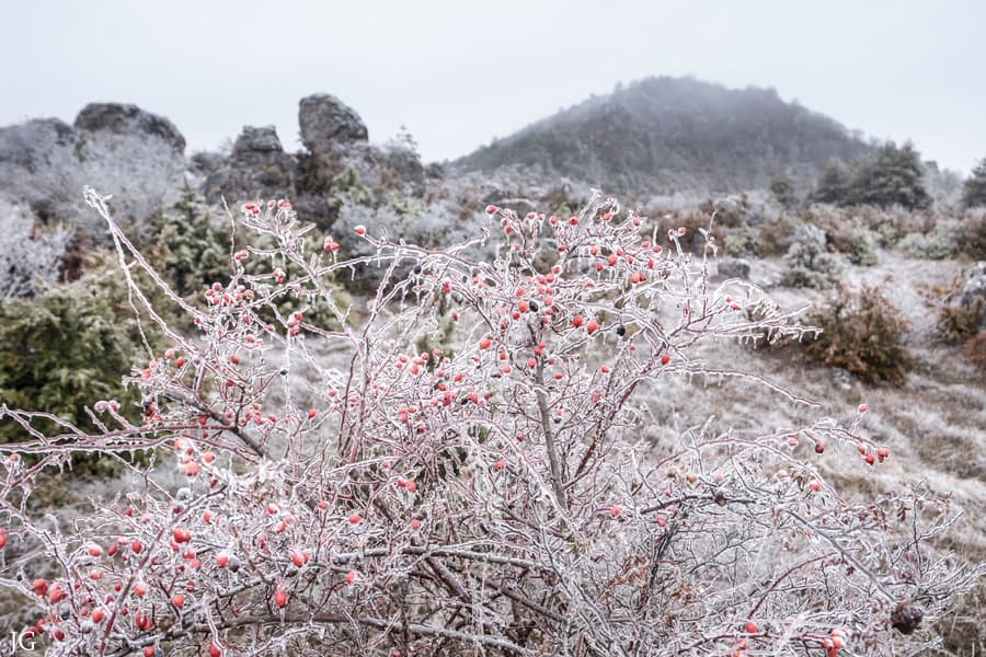 Pluies verglaçantes sur églantier observées au Caylar (Causse du Larzac) le 10 décembre 2017 - Illustration Jérémie GAILLARD