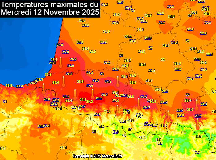 Comme le flux de sud est très dynamique, il accentue encore plus l'envolée des températures au pied des Pyrénées. C'est ce qu'on appelle l'effet de foehn : en arrivant sur les Pyrénées, l'air s'élève en suivant les pentes du relief et se refroidit. Lors de ce processus, l'air se décharge de son humidité. Une fois au sommet, l'air asséché redescend sur l'autre versant de la montagne en se réchauffant très rapidement. C'est ainsi que le thermomètre a atteint 29,8°C à Trois-Villes, 29,5°C à Aicirits et 29,3°C à Oloron dans les Pyrénées-Atlantiques ce mercredi 12 novembre 2025, du jamais vu en novembre ! Si nous étions en plein été, il ferait largement plus de 40°C et peut-être 45°C.