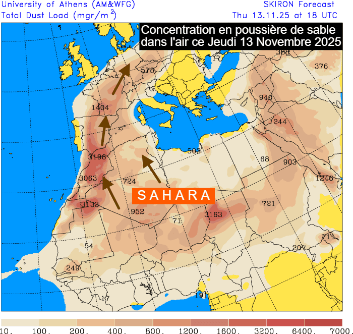 Autre fait caractéristique et qui ne trompe pas : les poussières de sable venues du Sahara survolent l'ensemble de la France ce jeudi 13 novembre 2025. Les concentrations sont parfois modérées, témoignant de la puissance de ce flux qui s'étend sur plusieurs milliers de kilomètres. Il faut dire que la configuration météorologique est idéale avec une dépression active sur le proche-Atlantique et un anticyclone sur l'Europe Centrale. Comme ces centres d'action bougent très peu, le flux de sud s'accélère et dure, permettant ces remontées sableuses et chaudes.