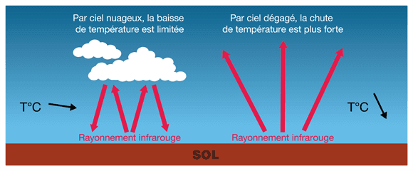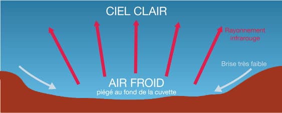 En effet, lors de certaines nuits claires (principalement en hiver mais également dans l'inter-saison), lorsque le sol a perdu de la chaleur par rayonnement thermique, la masse d'air située près du sol se refroidit plus rapidement que l'atmosphère environnante, formant ainsi une couche d'air froid bien plus dense d'une épaisseur allant de quelques mètres à plusieurs centaines. C'est ce que l'on appelle le phénomène de "rayonnement thermique".