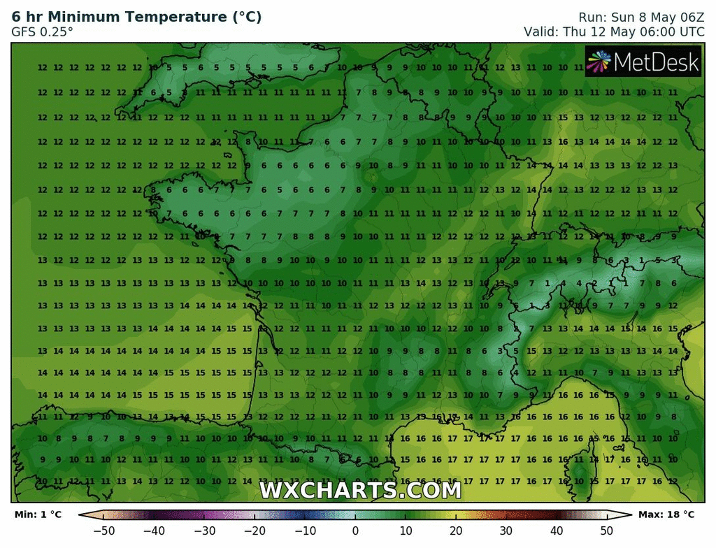 Températures minimales modélisées du 12 au 16 mai 2022 - Modèle GFS via WxCharts