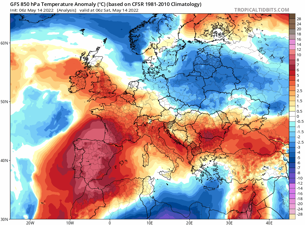 L'animation des anomalies de la masse d'air permet d'identifier ce dôme de chaleur entre le nord du Maghreb et le sud de la France, trouvant son paroxysme sur l'Espagne où la température de la masse d'air se trouve en moyenne 10 à 15°C au dessus des normales cette semaine ! Cela résulte de températures à 850 hPa (vers 1500m) généralement comprises entre 20 et 25°C, des niveaux dignes des canicules estivales, alors que nous ne sommes qu'en mai ! Dans le sud de l'Espagne, les 40°C ont été dépassés ce 20 mai 2022 !