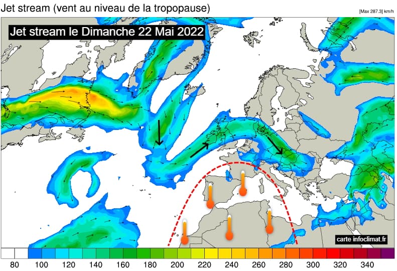 Courant jet sur l'Atlantique et l'Europe le dimanche 22 mai 2022 - carte infoclimat.fr