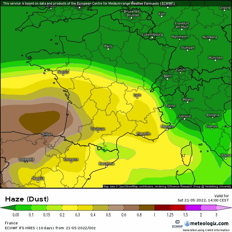 Dès ce samedi 21 mai 2022, des quantités modérées de poussières de sable du Sahara survolaient le sud de la France. Ce dimanche, elles vont s'étendre à la quasi-totalité du territoire et favoriser la formation d'un épais voile nuageux (ciel d'aspect laiteux). Elles s'évacueront par l'est lundi et comme elles seront associées à des averses et des orages, des dépôts pourront être observés.