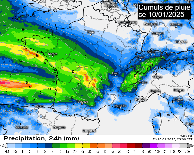 Cumuls de pluie prévus ce vendredi 10 janvier 2025 - meteologix.com