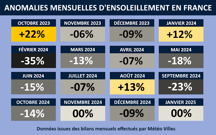 Anomalie mensuelles d'ensoleillement en France d'octobre 2023 à janvier 2025 - Météo Villes