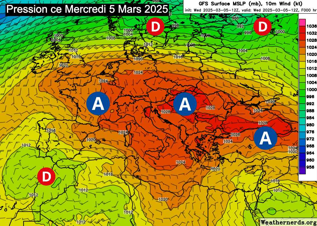Pression atmosphérique en Europe ce mercredi 5 mars 2025 - weathernerds.org
