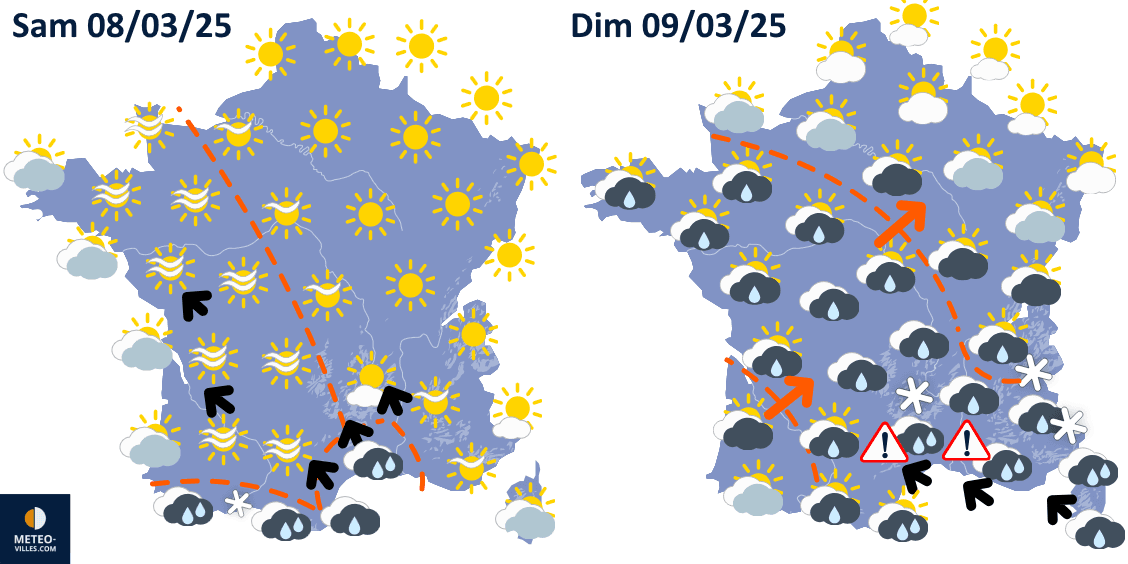 Ainsi, une dégradation interviendra au cours du week-end. Des averses circuleront déjà des Pyrénées au golfe du Lion et aux Cévennes samedi 8 mars 2025 avant le passage d'un front pluvieux plus actif en journée du dimanche 9 mars 2025. Les précipitations s'annoncent fortes sur les régions méditerranéennes, notamment des Cévennes vers la côte d'Azur où elles pourraient adopter un caractère orageux local. On attend également des chutes de neige sur les sommets.