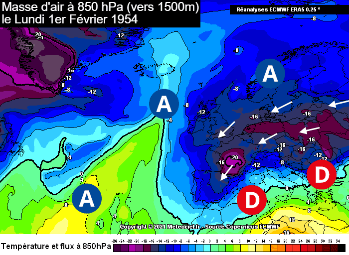 Masse d'air à 850 hPa (vers 1500m) le lundi 1er février 1954 - meteociel.fr