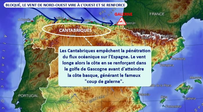 Le coup de galerne se forme lorsque de l'air anormalement doux ou chaud est présent sur la France et l'Espagne et qu'une masse d'air océanique nettement plus frais arrive par l'Atlantique. Lorsque le vent s'oriente au secteur nord-ouest, il se trouve bloqué par la chaîne des Cantabriques dans le nord de l'Espagne, si bien qu'il se voit forcé à se rabattre au secteur ouest et se renforce tout en longeant la côte espagnole jusqu'à atteindre les rivages basques. Avant la galerne, le vent est faible et vient de la terre avec une chaleur parfois forte puis lorsque le phénomène arrive, l'air se charge brutalement en humidité, la température s'effondre et le vent d'ouest souffle fortement, apportant un changement de temps radical !