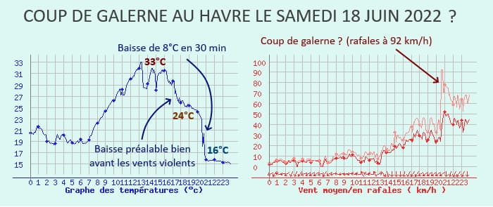 De nombreux médias ont alors évoqué un "coup de galerne" en Normandie. Pourtant, les relevés des stations ne sont pas vraiment comparables à Biarritz. Au Havre, le vent venait de la terre à la mi-journée avec jusqu'à 33°C mais celui-ci a basculé au nord-est dès l'après-midi avec une baisse progressive du mercure jusqu'aux environs de 24°C avant que le brutal coup de vent venu du nord ne survienne après 20h. On a alors enregistré plus de 90 km/h avec une chute d'environ 8°C (il ne faisait plus que 16°C). Le fait que le thermomètre ait perdu graduellement 9°C en après-midi avant l'arrivée des vents violents ne colle pas avec un coup de galerne, dont la chute est brutale et sans signe annonciateur.