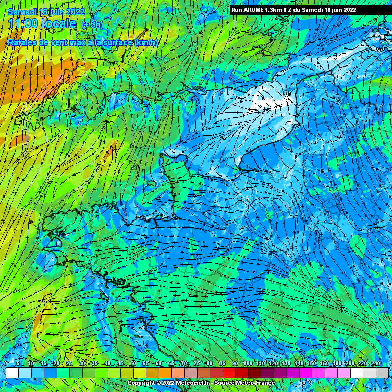 Modélisation des vents en Manche pour le samedi 18 juin 2022 - modèle AROME via meteociel.fr
