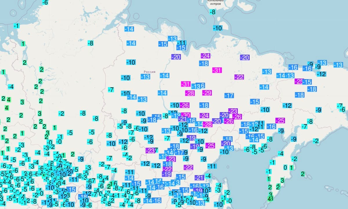 Les régions les plus septentrionales subissent, comme en Amérique du Nord, les premiers assauts de l'hiver bien sentis. Les premiers -30°C de la saison ont été observés ce 18 octobre en Sibérie Orientale avec jusqu'à -31°C à Deputatskij, Yakutia, -30,9°C à Batagaj-Alyta ou encore -29,8°C à Segen-Kyuel.