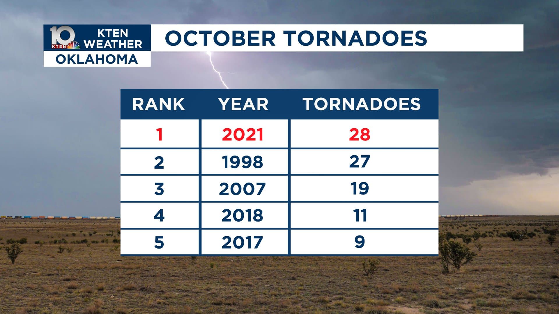 Classement du nombre de tornades recensées durant le mois d'octobre sur l'Oklahoma – Kten Weather