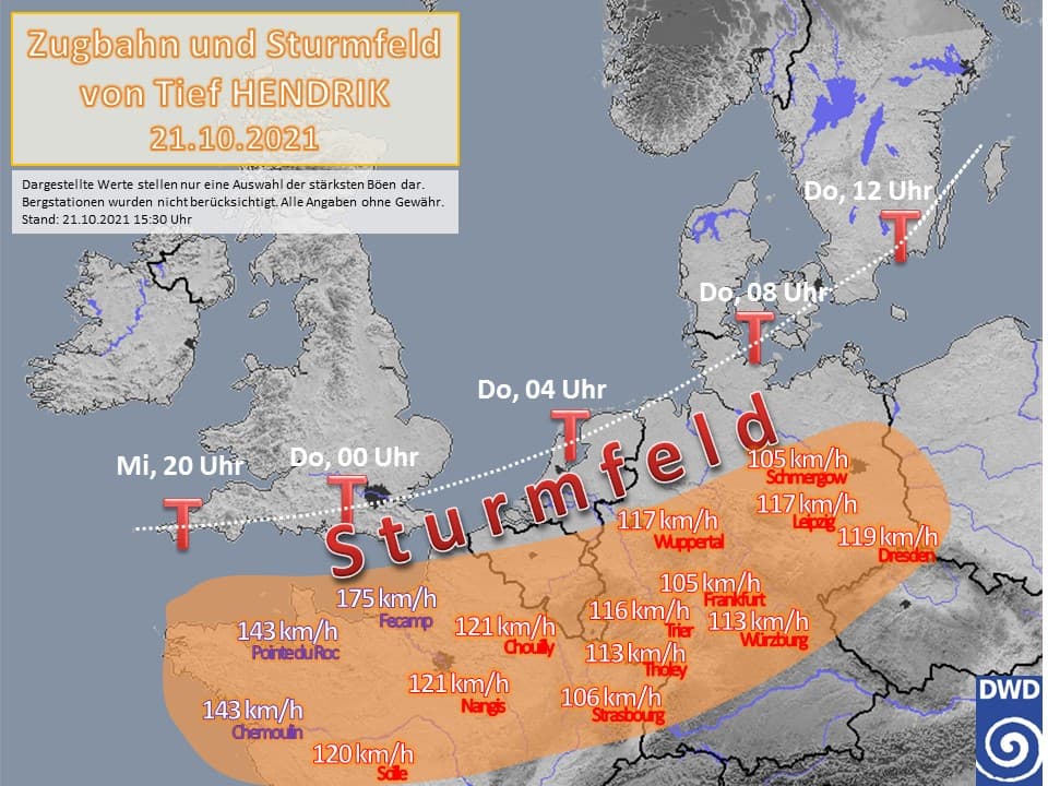 Rafales maximales relevées lors de la tempête Aurore sur l'Ouest de l'Europe – DWD