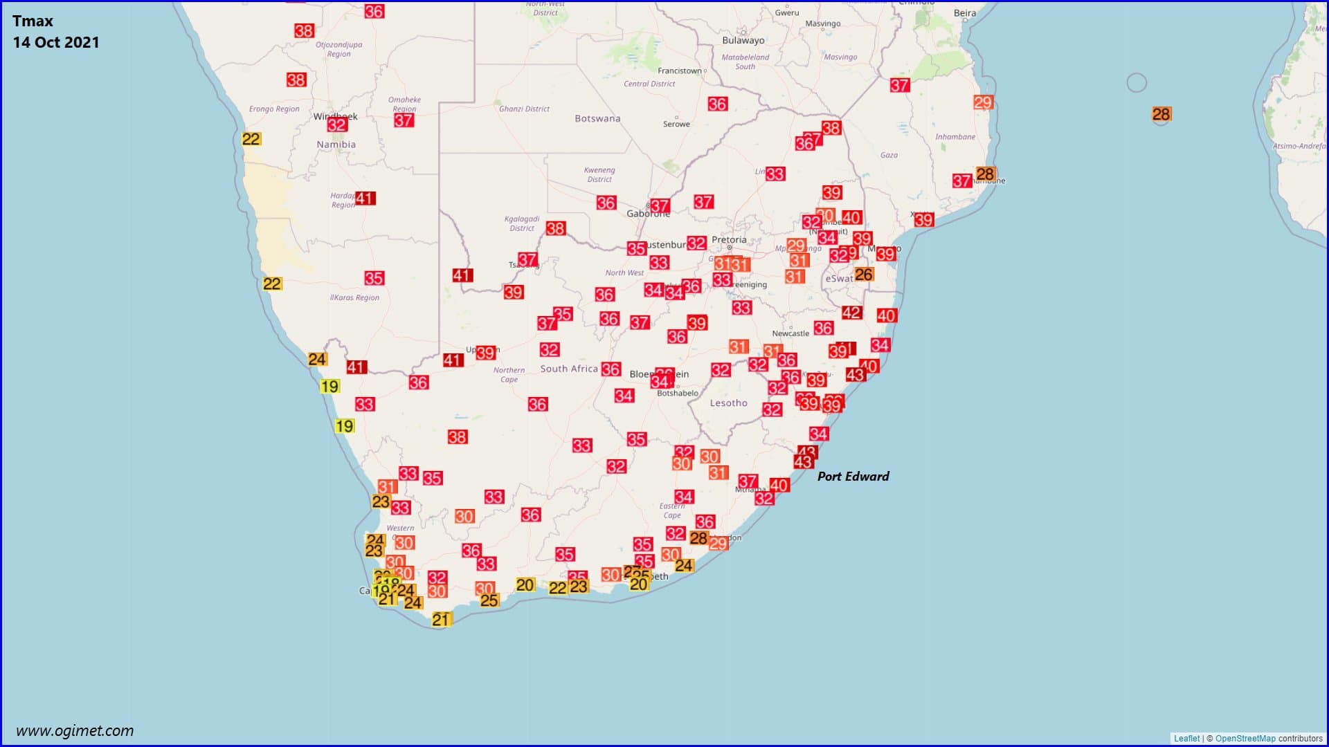 Températures maximales relevées le 14 octobre 2021 sur l'Afrique du Sud – Ogimet