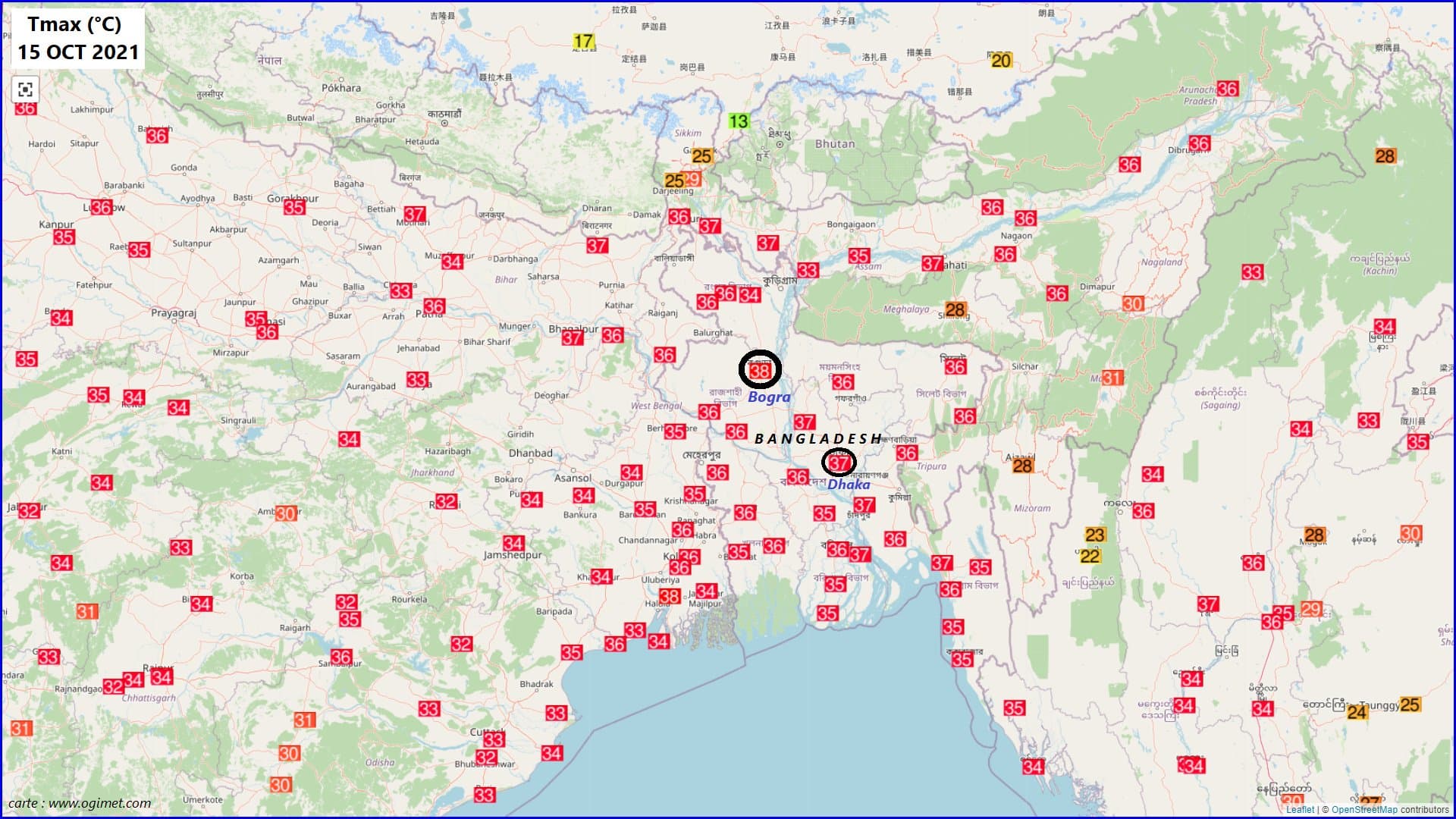 Températures maximales relevées au Bengladesh le 15 octobre 2021 – Via Ogimet