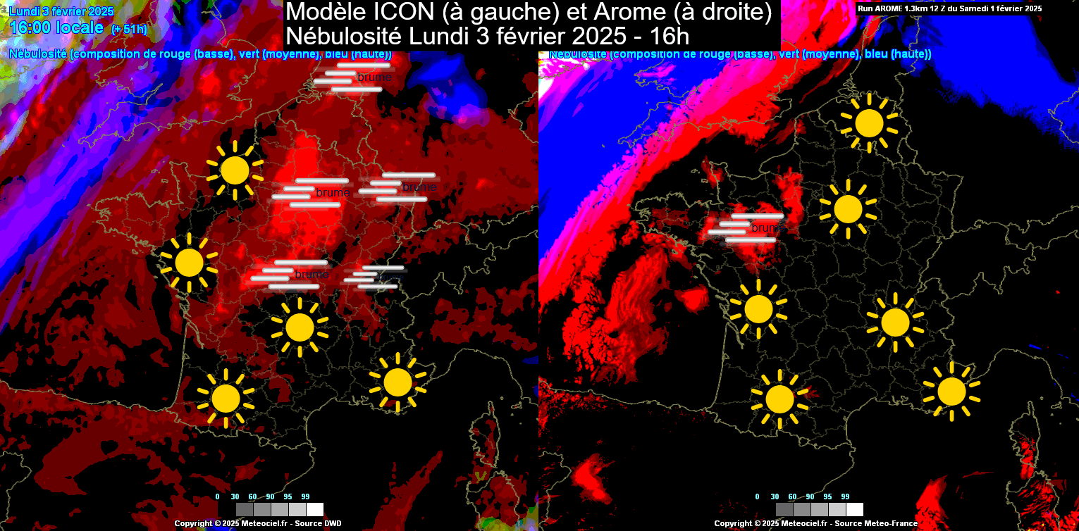 Différence de prévision entre ICON à gauche, et Arome à droite - Dans un cas les stratus concernent une vaste partie de la moitié Nord... sauf dans l'Ouest. Dans l'autre cas le Soleil est omniprésent partout... dans l'Ouest !