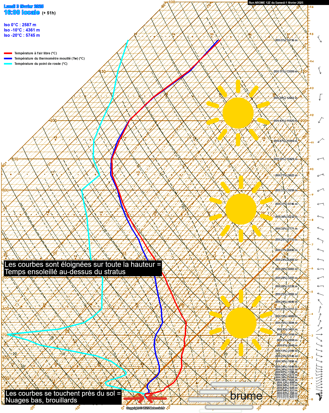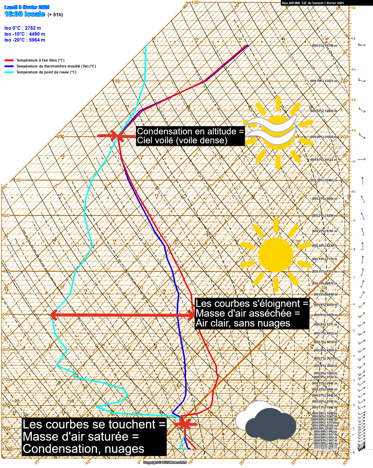 Ici, par exemple, la courbe se touche en deux endroits : entre 700 et 1500m, puis autour de 11500m. Il y a donc une couche de stratocumulus surplombée d'un voile nuageux de haute altitude. Le temps sensible est un ciel couvert.