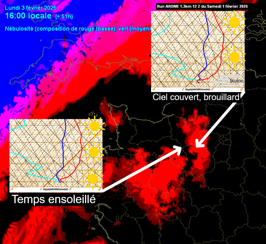 Vous pouvez constater que dans deux zones très proches, la présence de nuages bas (en rouge) dépend de variations infimes des courbes de l'émagramme météorologique.