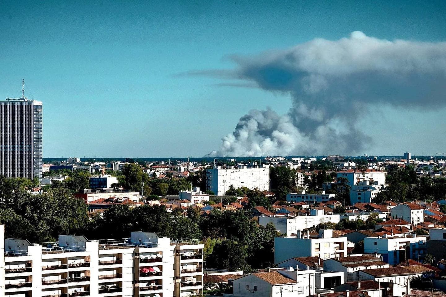 Vu du sol, c'est un immense panache de fumées qui se dressait dans le ciel de nombreuses communes girondines. Bordeaux n'a pas échappé à la règle. Le violent incendie de Landiras, évoluant à moins de 30 kilomètres de la préfecture du département, était bien visible pour les bordelais. La photo ci-dessous, prise en fin de journée du mardi 12 juillet 2022, témoigne de la virulence de l'incendie.