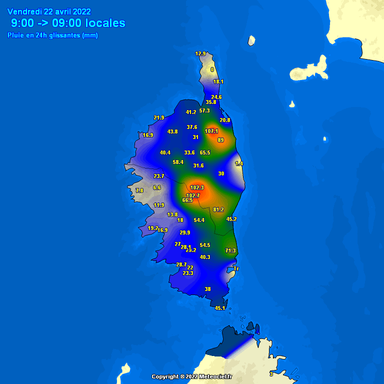 Cumul pluviométrique sur 24h en Corse - du jeudi 21 avril 09h au vendredi 22 avril 09h - Météociel