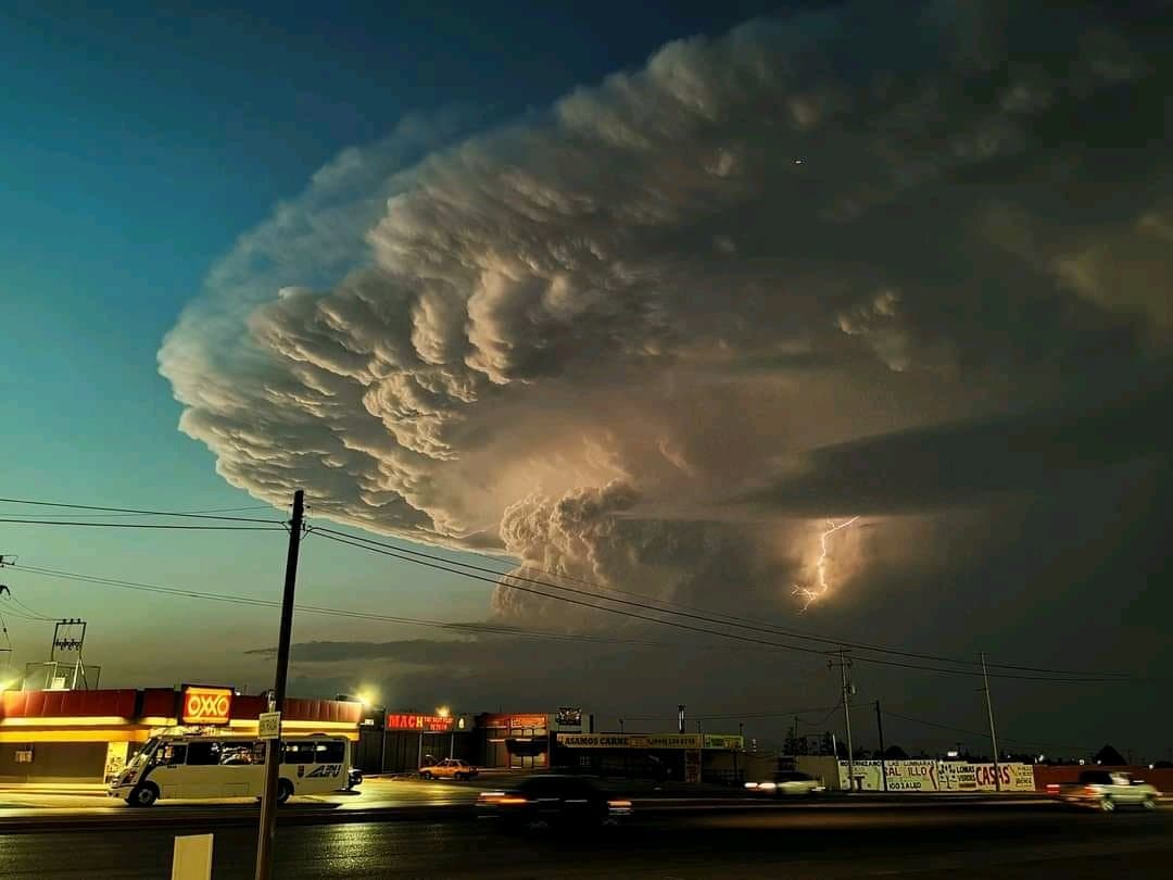 Dans la soirée du 17 avril, les habitants de Saltillo, dans le désert mexicain de Chihuahua, ont assisté à un spectaculaire orage de type supercellulaire. Le cumulonimbus, dont le sommet a atteint plus de 12km d'altitude, a alors pris la forme d'une explosion atomique de par sa forme particulièrement circulaire. Une forte activité électrique et des grêlons allant jusqu'à 3cm de diamètre ont été observés dans le secteur. Ce violent orage supercellulaire a pris forme en raison d'un violent conflit de masse d'air (arrivée d'un air plus frais après plusieurs jours de températures bien au dessus des moyennes de saison).