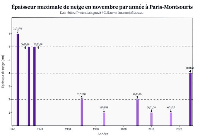 Épaisseurs de neige maximales en novembre à Montsouris depuis 1960 - Graphique : G. Jauseau