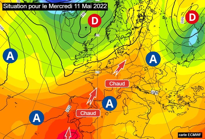Cette nouvelle accentuation de la chaleur à la mi-mai 2022 sera liée à une migration de l'anticyclone du bassin méditerranéen vers la Scandinavie tandis qu'une dépression dynamique devrait se positionner au large sur l'Atlantique. Ainsi, le flux de sud pourrait s'accélérer en faisant remonter de l'air venu directement du nord de l'Afrique. Cette tendance dominerait la semaine du 16 au 22 mai 2022. Cependant, des incertitudes concernent la proximité des basses pressions et leur capacité à développer (ou non) une instabilité orageuse sur la France.