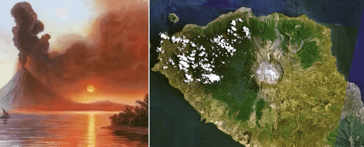 Représentation de l'éruption du Tambora en 1815 et photo récente du volcan - via Frederic Church