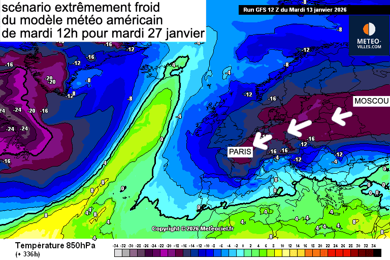Selon le dernier scénario du modèle météo américain de mardi midi pour le 27 janvier, de l'air glacial, directement venu de Sibérie, envahirait toute l'Europe occidentale et notamment sur le nord de la France... Un scénario à prendre avec beaucoup de recul, mais aussi à suivre ! carte Meteociel