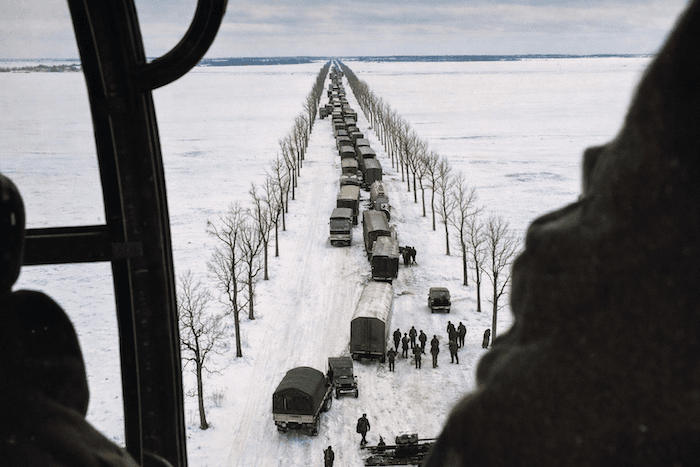 Photographiés de la cabine d'un hélicoptère, venu leur porter secours, ces poids-lourds sont bloqués dans l'immensité blanche de la RN 10 non loin de Rambouillet. Des villages sont coupés du monde dans le nord de la Beauce, des routes sont bloquées, des automobilistes, prisonniers de leur véhicule attendent durant des heures dans l'angoisse que l'on vienne les libérer. D'autres préférant chercher le salut dans la marche, ne sachant pas qu'ils allaient au devant de la mort ! Congestion, asphyxie, incendie : les victimes se comptent par dizaines… Le manque criant de chasses-neige obligent des hélicoptères et des chars de l'armée à intervenir, mais n'évite pas des drames... Illustration issue de l'ouvrage "Quel temps".